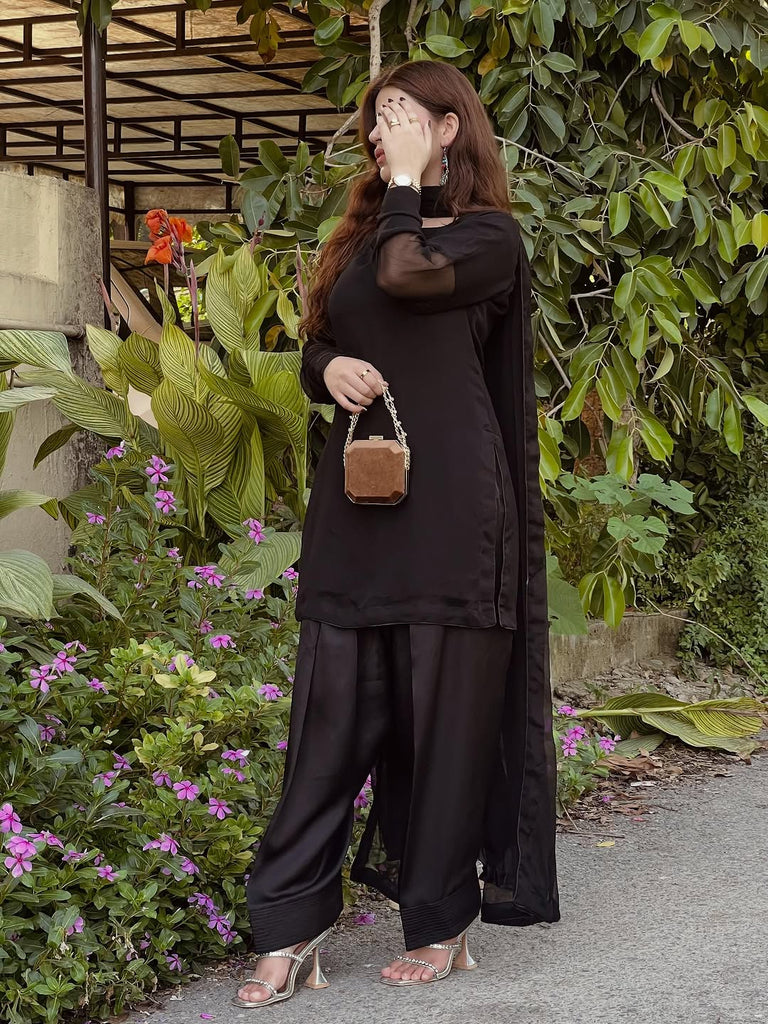 Crafted in soft georgette with sheer sleeves and a square neckline, it brings modern poise to traditional roots. The fluid silhouette paired with statement pleated trousers creates a graceful harmony of structure and flow. Perfect for evening gatherings, elegant brunches, or festive soirΓ©es where less truly says more.